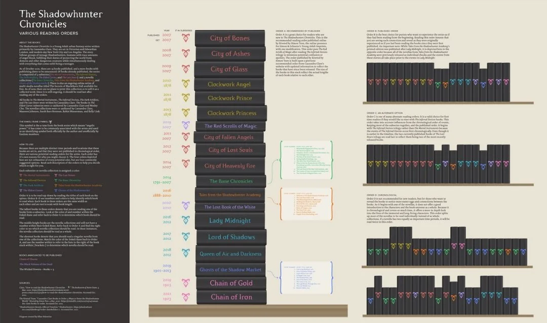 This universe is expansive and there are multiple ways to dive in! Ellen (@staysunny on Encycla) and Philip (@philipn on Encycla) have created this incredible diagram of all the different ways you can read the chronicles. They’ve also written a corresponding article as well! Head to: https://encycla.com/The_Shadowhunter_Chronicleshttps://encycla.com/The_Shadowhunter_Chronicles to check it out! I also reccomened heading over to Cassie’s website which allows you to explore the timeline for the series as well - https://cassandraclare.com/exploring-the-shadowhunter-chronicles/